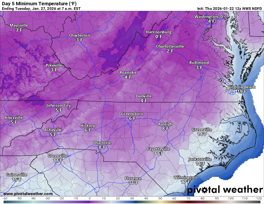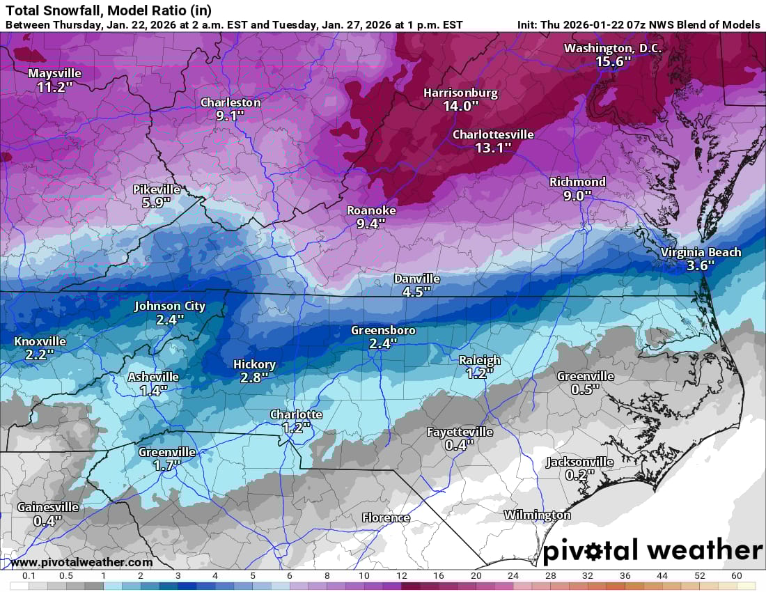 There are some major changes to the forecast for this Sunday’s winter storm…models have shifted the track further north, allowing warmer air aloft to change snow over to sleet then freezing rain Sunday morning or around noon (depending on which model you look at). Either way, ice accumulations of up to 3/4” are possible by Sunday night, again, followed by extreme cold the rest of the week, with lows in the low teens and some single digits and highs only in the mid to upper 20s. Because of the change to sleet and freezing rain, snow accumulations are lowered to 7 to 10 inches in the Richmond area, with the heaviest snow bands shifted up towards Fredericksburg, Charlottesville, and D.C. where a foot or more is still likely.